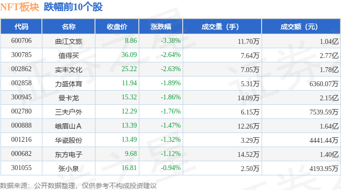 从资金流向上来看,当日NFT板块主力资金净流入2.29亿元,游资资金净流出3.93亿元,散户资金净流入1.64亿元。NFT板块个股资金流向见下表: