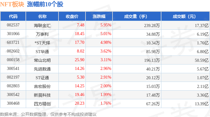 NFT板块5月14日涨113%海联金汇领涨主力资金净流入