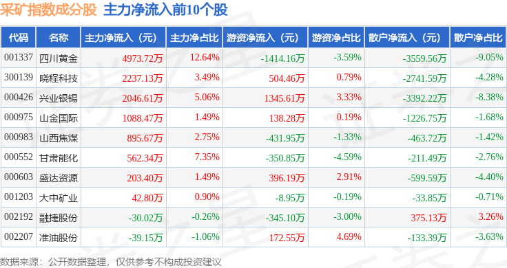 资金流向方面,采矿指数(399232)成份股当日主力资金净流入合计2155.79万元,游资资金净流入合计728.06万元,散户资金净流出合计2883.85万元。成份股资金流向详情见下表: