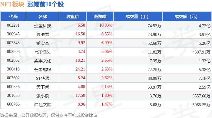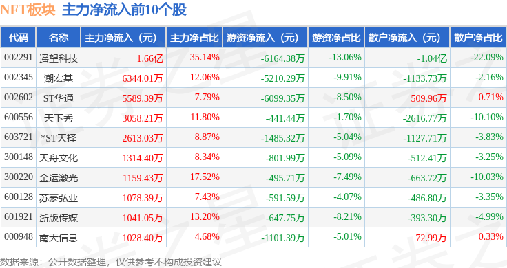 从资金流向上来看,当日NFT板块主力资金净流出1.14亿元,游资资金净流出3.75亿元,散户资金净流入4.88亿元。NFT板块个股资金流向见下表: