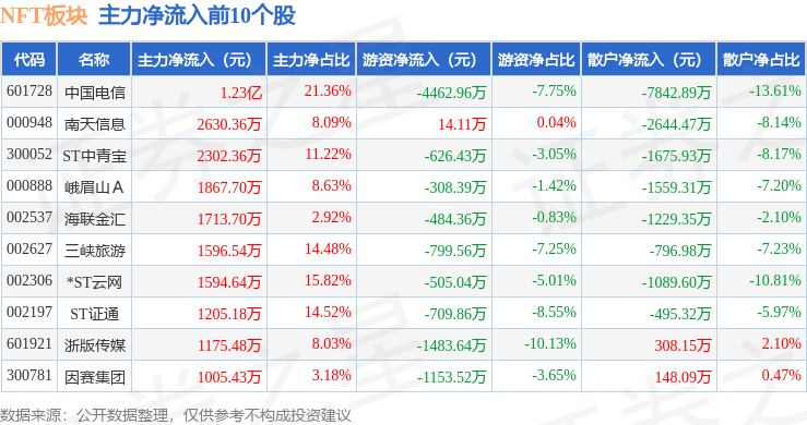 从资金流向上来看,当日NFT板块主力资金净流出3.4亿元,游资资金净流出2.68亿元,散户资金净流入6.08亿元。NFT板块个股资金流向见下表: