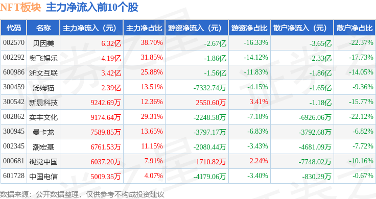从资金流向上来看,当日NFT板块主力资金净流入18.12亿元,游资资金净流出7.73亿元,散户资金净流出10.39亿元。NFT板块个股资金流向见下表: