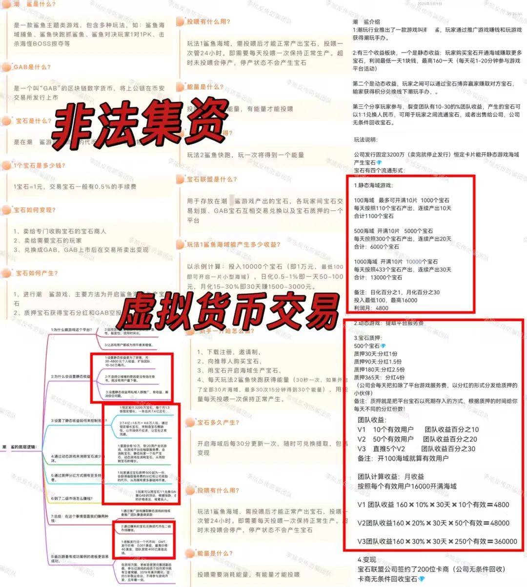 该项目存在“拉人头”“团队计酬”特征,通过分享玩家参与形成团队,并按团队业绩比例计酬,符合《禁止传销条例》中对传销的界定。 以购买宝石开通海域获取收益为诱饵,承诺高额回报,形成资金池,具备非法集资的“利诱性”“非法性”特征。发行“GAB”虚拟代币并计划上交易所交易,属非法金融活动。