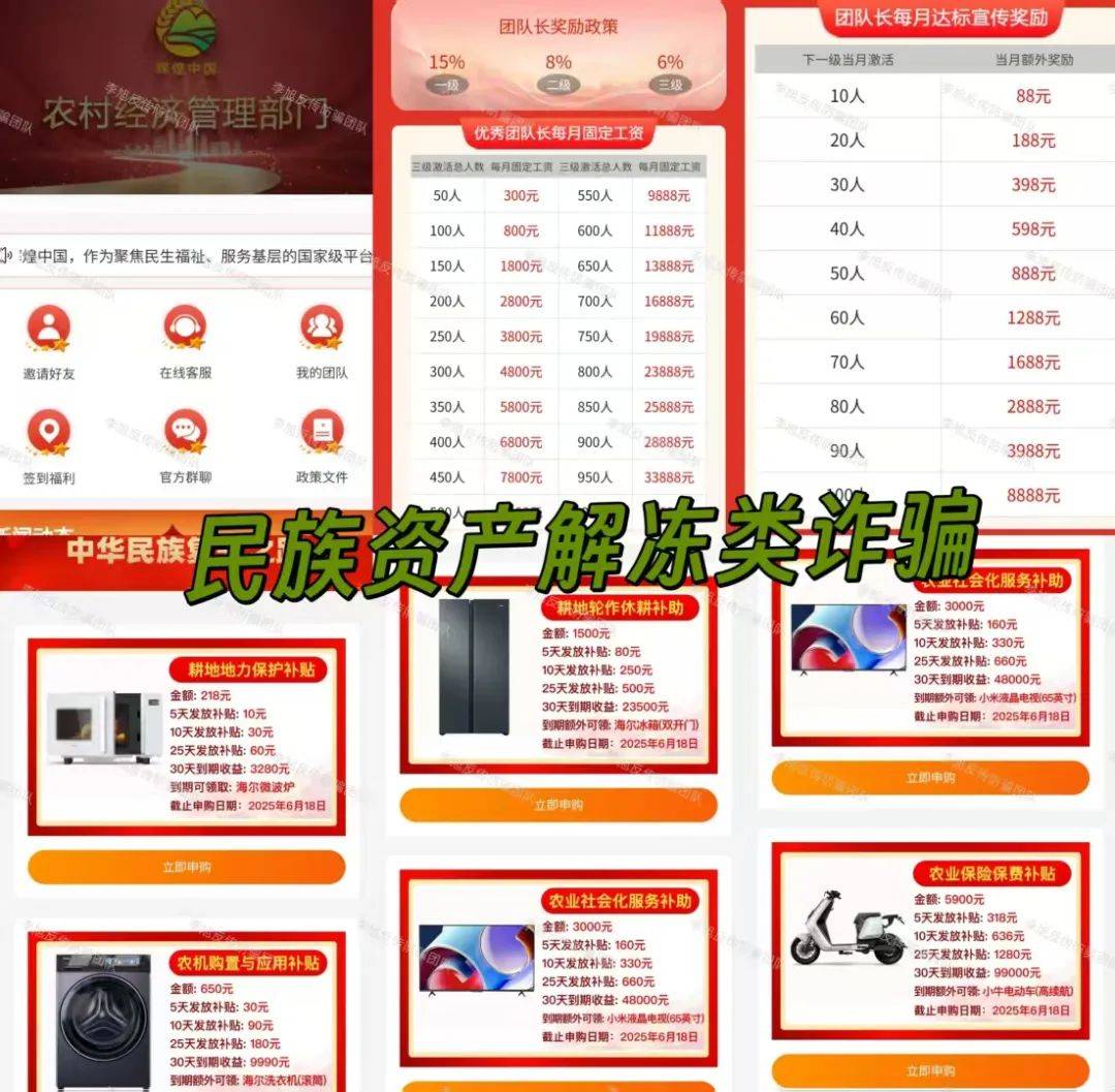 冒充“农村经济管理部门”,伪造散布涉诈APP,推出虚假投资理财项目。推荐新人享三级分佣,并根据团队人数发放工资。夏季完成每月激活任务还有额外奖励。该项目并非国家项目,下载提示未备案。