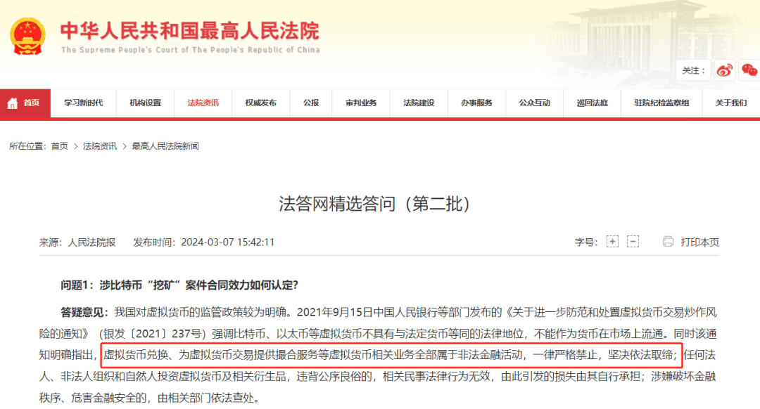 据最高人民法院网发布的《法答网精选答问(第二批)》,文中明确写明,虚拟货币兑换、为虚拟货币交易提供撮合服务等虚拟货币相关业务全部属于非法金融活动,一律严格禁止,坚决依法取缔;同时文中提到,参与虚拟货币交易,自行承担损失。