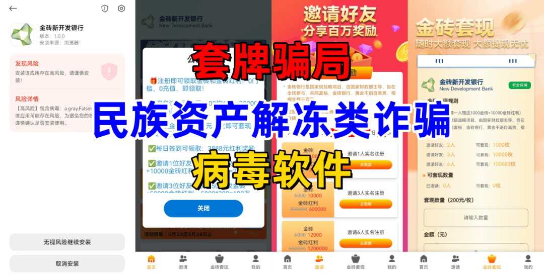 该项目冒充“金砖国家新开发银行”的名义,制作散布涉诈APP,声称实名注册即可获得1000枚金砖,2万金砖红利,声称每一枚金砖价值200元可提现,发展下线同样可以获得高额收益。