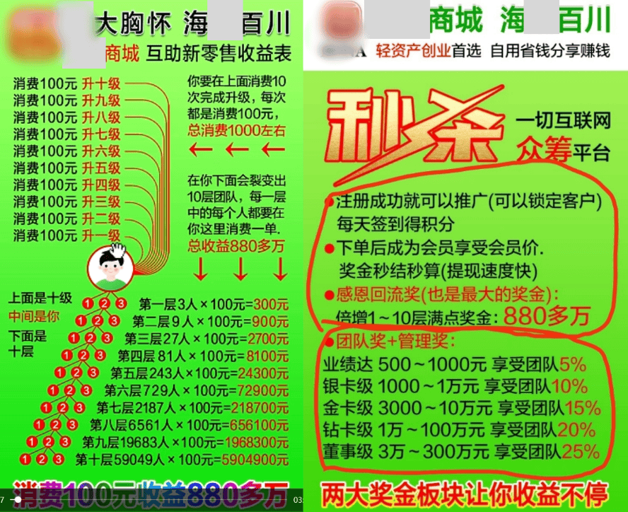 模式:该传销组织“自愿连锁经营”“阳光工程”“国家项目”的旗号,以网恋交友、介绍工作、旅游等名义将人骗至西安进行洗脑,鼓吹投资一份3800元,31份102800元,采用五级三阶制,出局可以获得1380万元的回报。