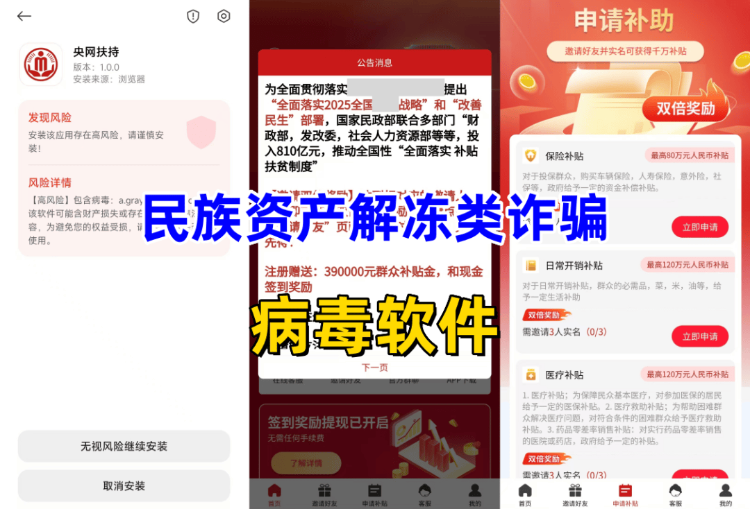 该项目冒充“民政部”的名义,打着振兴消费的旗号,制作散布涉诈APP,声称投入810亿元,补贴扶贫,参与即可获得39万元补贴金,签到可获得2000现金奖励,发展下线同样获得高额收益。