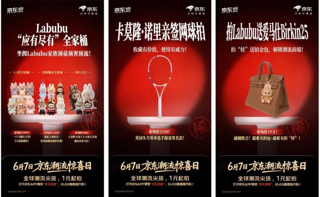 比如在雷佳音的美食惊喜日,京东618承包岭南千年荔枝树,让消费者可以吃到杨贵妃同一棵树上的荔枝,在京东站内直播雷佳音发美食券请你吃外卖。在六一惊喜日当天,京东直播看动画片,赠送10万只铁皮小青蛙,让消费者重温童年记忆。潮流惊喜日则是1元起拍潮流尖货,包括Labubu限量款。