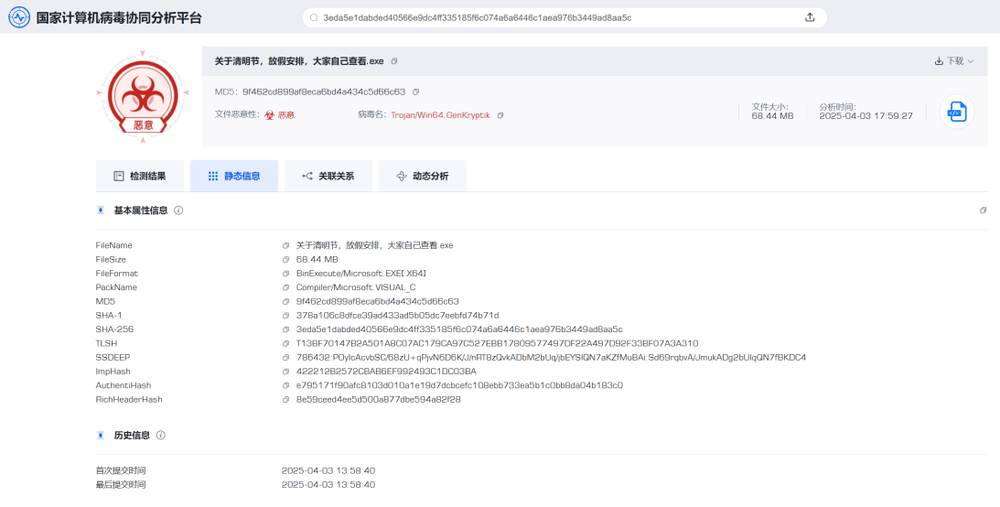 近日,国家计算机病毒应急处理中心和计算机病毒防治技术国家工程实验室依托国家计算机病毒协同分析平台(在我国境内连续捕获一系列针对我国网络用户,特别是财务和税务工作人员用户的木马病毒。这些病毒的文件名称与2025年“税务稽查”“所得税汇算清缴”“放假安排”等诱饵主题相关,实际为恶意可执行程序,全部针对Windows平台用户,主要通过社交媒体中转发的钓鱼网页链接进行传播。经过分析后发现这些病毒均为“银狐”(又名:“游蛇”“谷堕大盗”等)家族木马病毒变种,如果用户运行相关恶意程序文件,将被攻击者实施远程控制、窃密、挖矿等恶意操作,并可能被利用充当进一步实施电信网络诈骗活动的“跳板”。