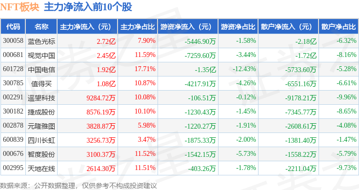 从资金流向上来看,当日NFT板块主力资金净流出5.2亿元,游资资金净流出1.17亿元,散户资金净流入6.37亿元。NFT板块个股资金流向见下表: