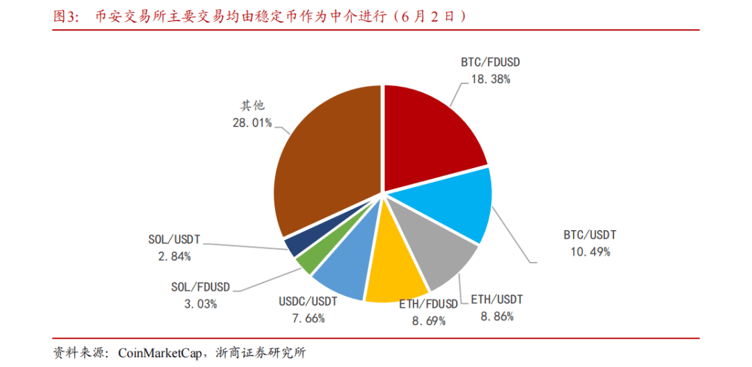 二是链上交易方面,交易所中的数字货币交易基本实现稳定币本位。截至2025年6月3日,稳定币在币安作为交易中介完成了超过90%的交易,且主要的市场“交易对”也都是以数字货币/稳定币的形式出现。同时“稳定币”也是链上金融服务的锚定资产,例如数字货币借贷平台“Compound”、去中心化交易所“Uniswap”(“链上”交易所)等,其交易协议均依赖“稳定币”运行。