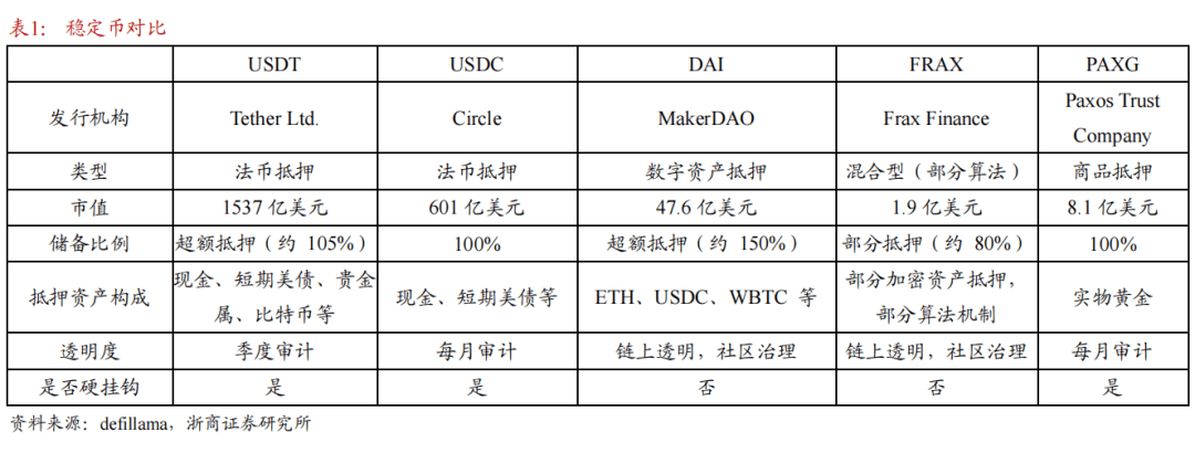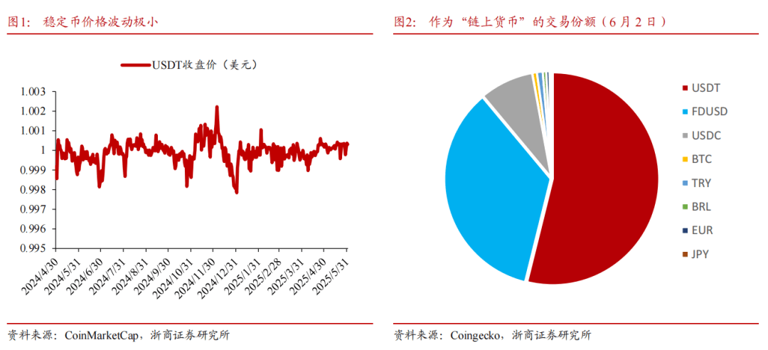 依照GENIUS法案,稳定币是一种用作付款或结算的数字资产,而不是货币或证券,其发行人有义务以固定金额的货币价值转换、赎回和回购,并维持其对固定货币的稳定价值。与比特币、以太坊等传统数字货币相比,其价格与低波动资产挂钩,且不直接受市场供求决定,因而成为区块链上低风险资产。以USDT为例,截至2025年6月3日,其过去一个月的价值偏离度(与1美元相比)仅有-0.01%。