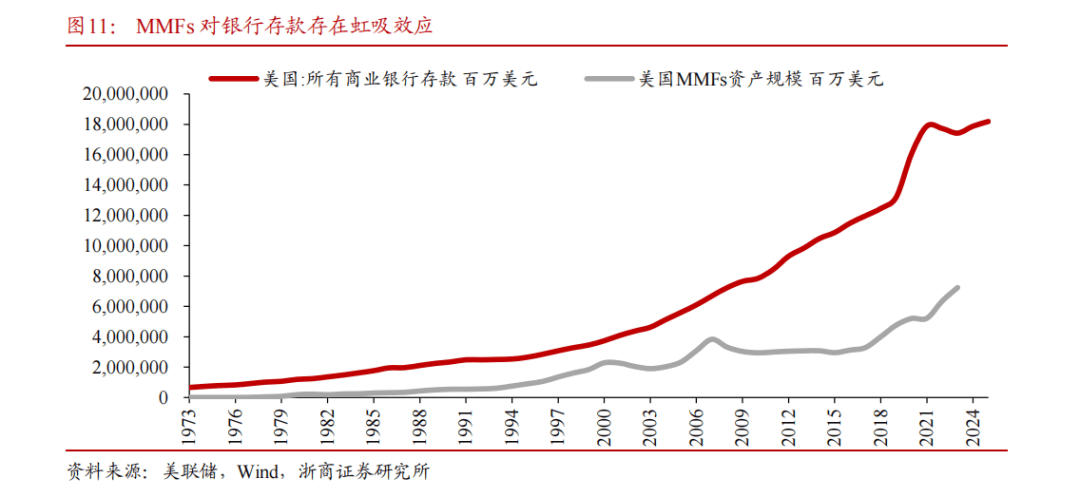 稳定币发行类似于美国七十年代货币市场基金创造初期(但区别在于稳定币本身并不生息,货币市场基金有收益率),对银行存款存在虹吸效应。1970年代,美国出现了一批货币市场共同基金(Money Market Mutual Funds,后文简称MMFs),其承诺每日净资产值(NAV)稳定在1美元,并且通过投资短期国债、商业票据等高流动性资产,来获取高于银行活期存款的收益。工具出现后对银行存款形成虹吸。