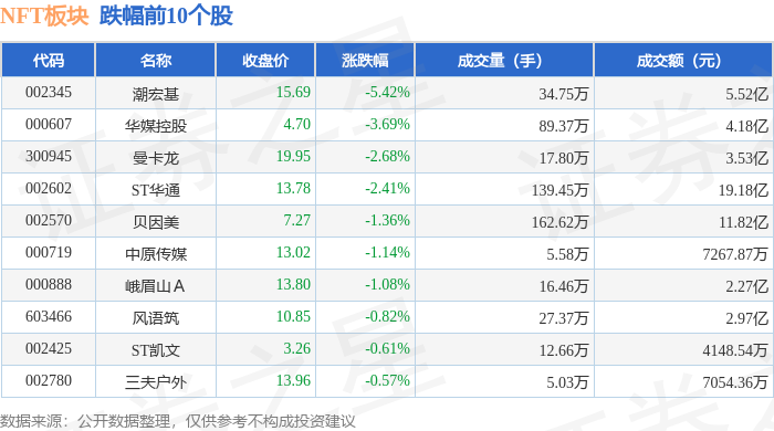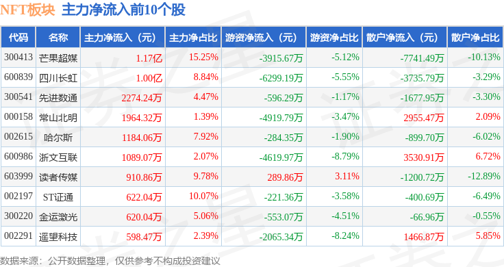 从资金流向上来看,当日NFT板块主力资金净流出9.24亿元,游资资金净流出2.92亿元,散户资金净流入12.16亿元。NFT板块个股资金流向见下表: